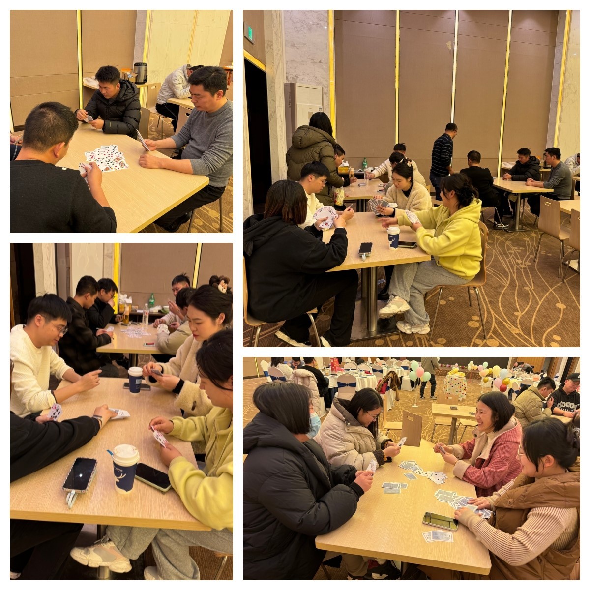 年會的序曲在下午悄然奏響,一場緊張刺激又趣味橫生的摜蛋比賽火熱上演。員工們自由組隊,斗智斗勇,不僅展現(xiàn)了高超的牌技,更在輕松愉快的氛圍中加深了同事間的友誼。比賽間隙,桌上擺滿了各式各樣的零食和飲料,從香脆可口的薯片到清甜解膩的水果,從醇厚的咖啡到清新的茶飲,滿足了大家挑剔的味蕾,也為下午的時光增添了幾分愜意與溫馨。