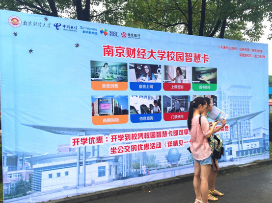 在南京財經(jīng)大學(xué)今年的新生報到中,學(xué)校的一卡通中心門口人山人海,很多學(xué)生前來辦理NFC校園智慧卡業(yè)務(wù),學(xué)生領(lǐng)到了南京電信提供的校園智慧卡,利用電信為他們提供的NFC手機即可立刻開通校園卡、市民卡、南京銀行閃付卡,一張卡讓學(xué)生玩轉(zhuǎn)校內(nèi)外生活。