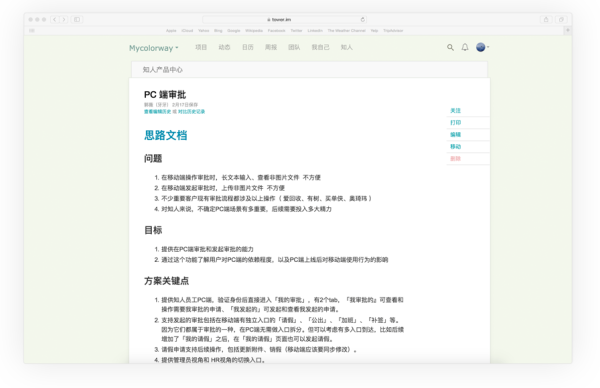 我們團(tuán)隊在開發(fā)一個功能點(diǎn)的時候,會要求產(chǎn)品經(jīng)理至少寫兩份文檔,一份叫做「思路筆記」,這份筆記主要是產(chǎn)品負(fù)責(zé)人個人對于功能點(diǎn)的思考,要解決的問題是什么,解決的思路是什么,有沒有什么想得到的坑,怎么測試,上線以后用什么數(shù)據(jù)衡量功能是否成功。產(chǎn)品經(jīng)理會把這份文檔發(fā)給負(fù)責(zé)開發(fā)的工程師先看一陣子,然后大家會約定好一個時間進(jìn)行遠(yuǎn)程視頻會議,在視頻會議上,每個人提出他們的問題,供產(chǎn)品經(jīng)理參考。
