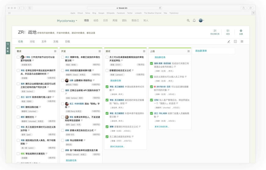 對于遠(yuǎn)程團(tuán)隊來說,解決溝通是第一位的,我們用 Tower 解決工作計劃的問題,在 Tower 里圍繞項目、任務(wù)、文檔和文件來溝通工作的計劃,以及推進(jìn)工作計劃。但是也不可能把所有溝通都放在 Tower 上,所以我們團(tuán)隊平時還會重度使用企業(yè)微信這個 IM 產(chǎn)品。