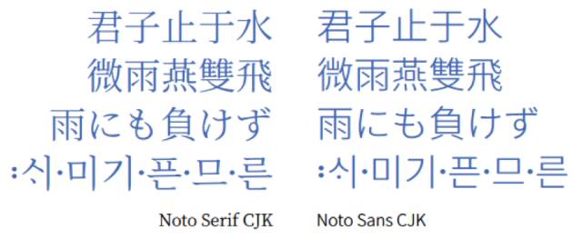 Noto Serif CJK 軟件包具備與 Noto Sans CJK 相同的功能:
