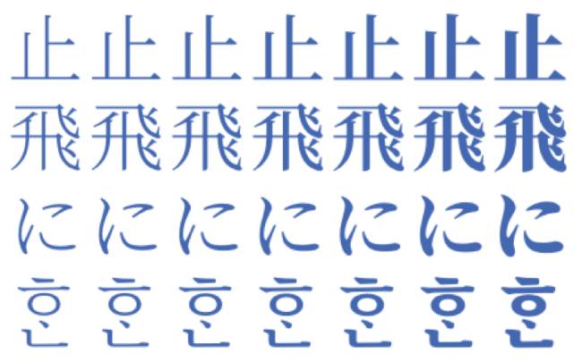 ▲ Noto Serif 和 Sans CJK 中“永”字的設(shè)計。此表意文字聞名之處在于,它包含了書法筆劃中最重要的元素。它常用于評估書法或字樣設(shè)計。